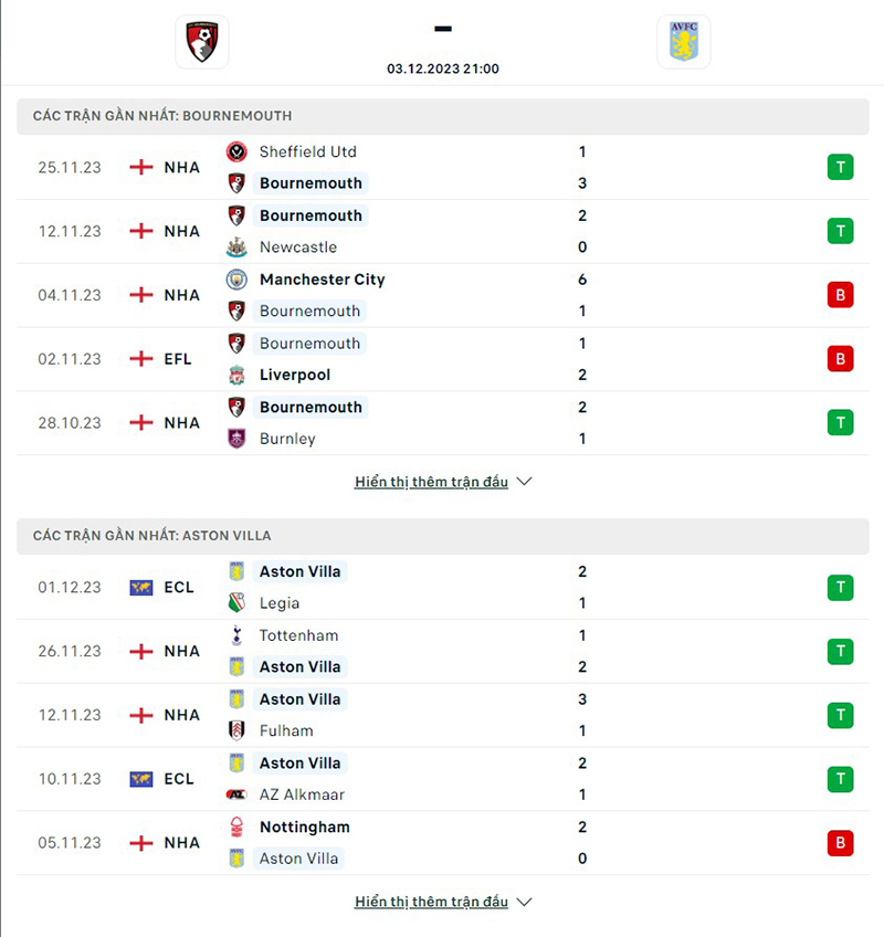Phong độ thi đấu của đội tuyển Bournemouth vs Aston Villa