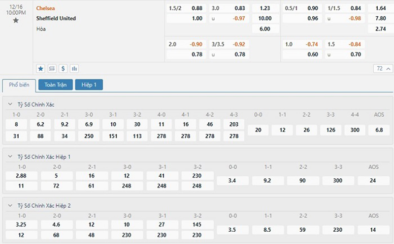 - Kèo châu Á Chelsea chấp 1.5/2 trái fulltime => Chọn Sheff Utd.