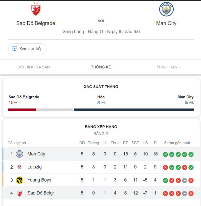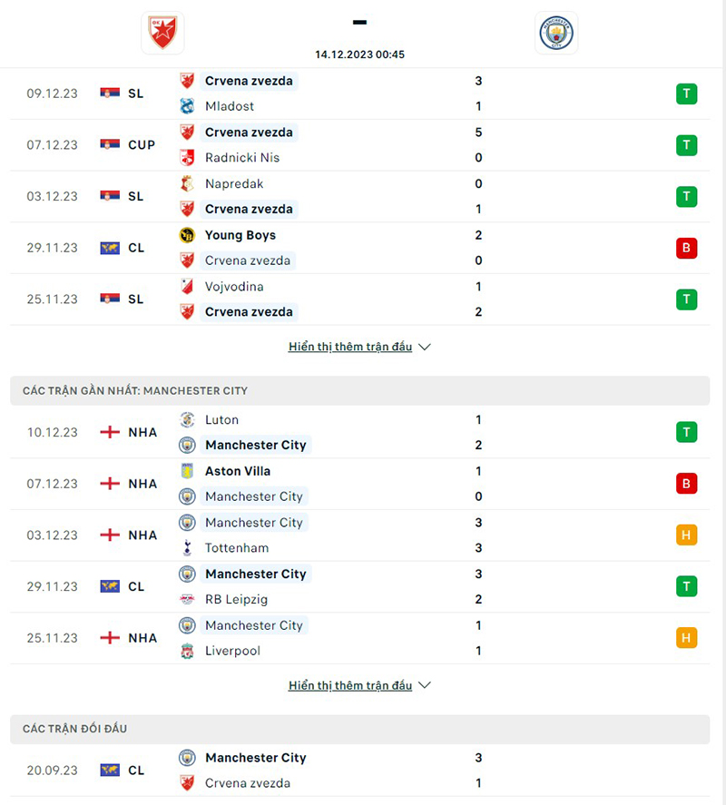 Phong độ thi đấu của đội tuyển Crvena Zvezda vs Man City