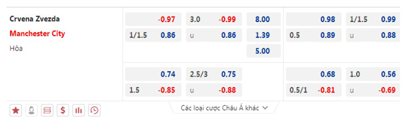 Kèo châu Á Crvena Zvezda vs Man City: Man City chấp 1/1.5 trái fulltime