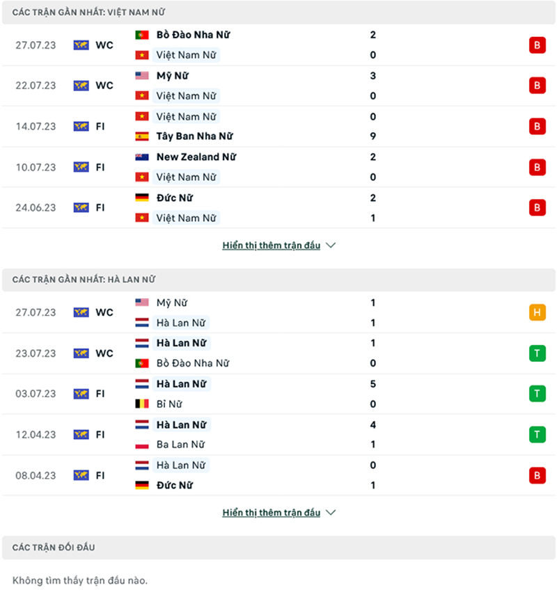 Thành tích thi đấu của đội tuyển nữ Việt Nam vs nữ Hà Lan