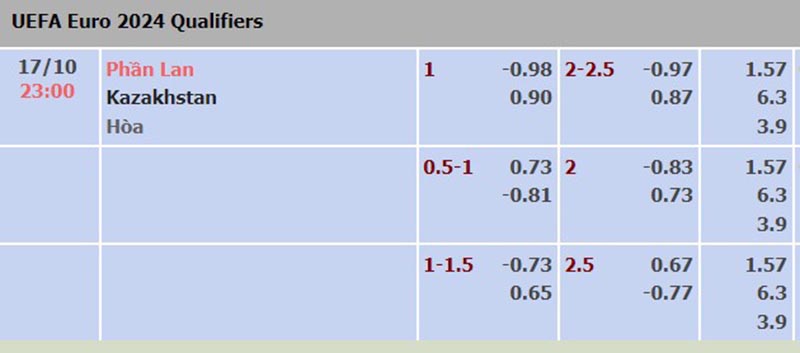 Bảng tỷ lệ kèo trận đấu giữa đội tuyển Phần Lan vs Kazakhstan