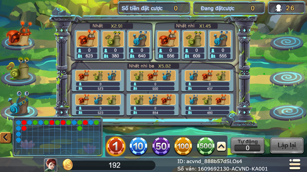Chọn đặt cược theo thứ tự ưu tiên các con ốc sên đỏ, lục, lam. Khi kết quả mở thưởng khớp với thứ tự mà bạn đặt cược thì coi như trúng thưởng, những trường hợp khác tính là không trúng thưởng.
