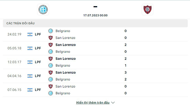 Lịch sử đối đầu giữa đội tuyển Belgrano vs San Lorenzo