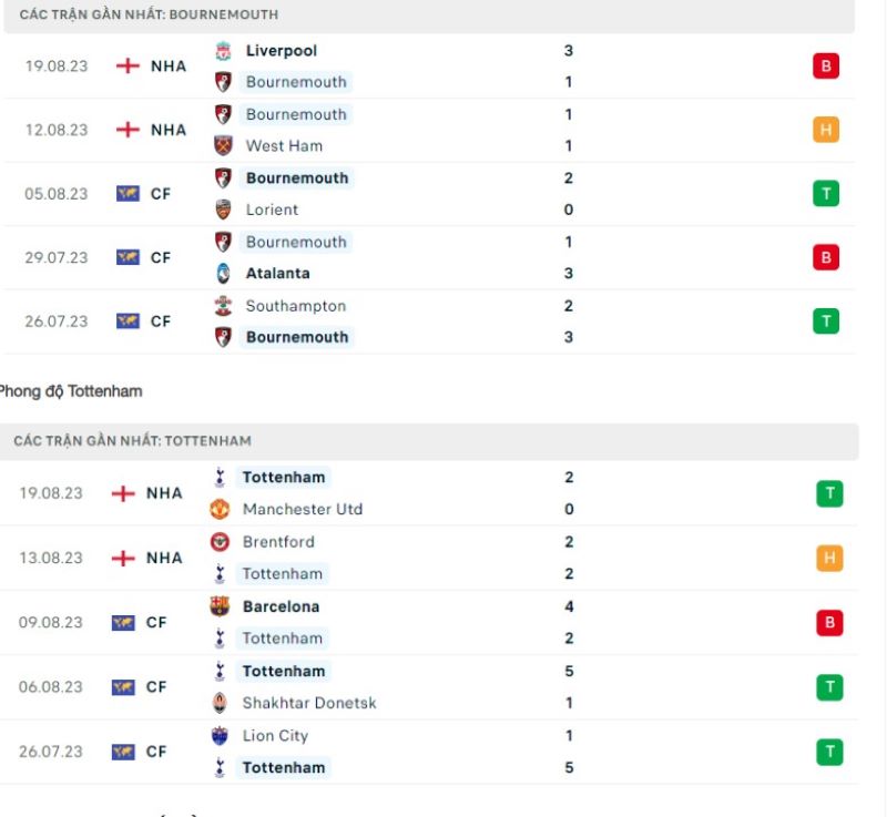 Phong độ thi đấu của đội tuyển Bournemouth vs Tottenham
