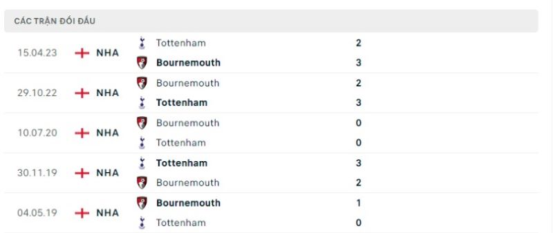 Theo thống kê 5 trận đối đầu gần đây nhất giữa Bournemouth vs Tottenham gần đây nhất thì mỗi đội đều thắng 2 trận và hòa 1 trận. Đối với Bournemouth thì đây quả là một thành tích khá tốt.