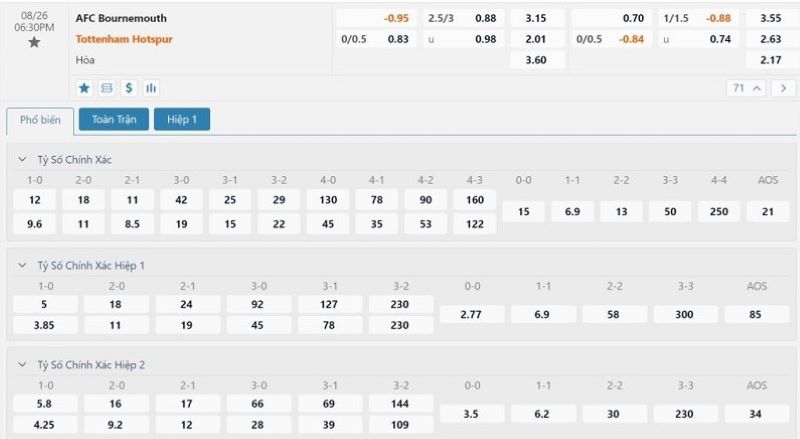 Bảng tỷ lệ kèo trận đấu giữa Bournemouth vs Tottenham