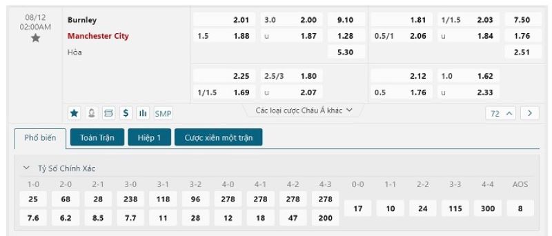 Soi kèo trận đấu giữa đội tuyển Burnley vs Man City