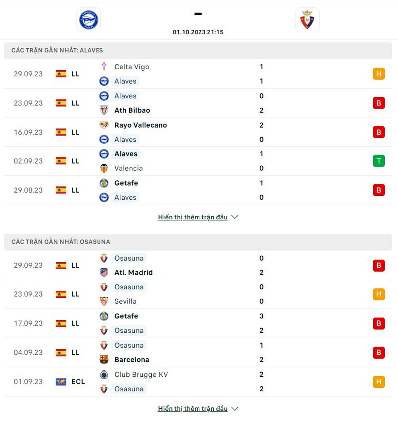 Phong độ thi đấu giữa đội tuyển Alaves vs Osasuna