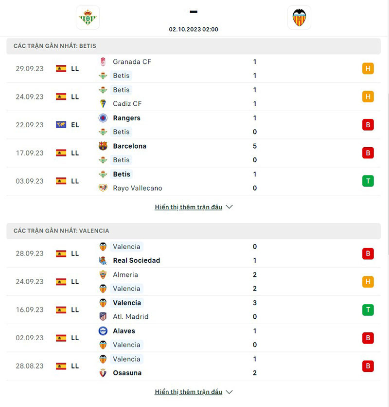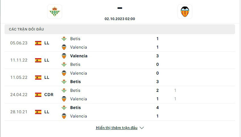 Kết quả đối đầu giữa đội tuyển Betis vs Valencia