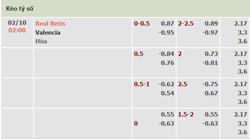 Bảng tỷ lệ kèo trận đấu giữa đội tuyển Betis vs Valencia