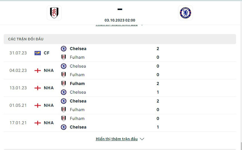 Kết quả đối đầu giữa Fulham vs Chelsea gần đây nhất, đội tuyển Chelsea đang có thành tích thi đấu tốt hơn. Cụ thể họ thắng 3 trận, hòa 1 trận và để thua 1 trận trước đội tuyển Fulham.