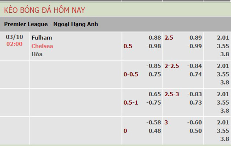 Bảng tỷ lệ kèo trận đấu giữa đội tuyển Fulham vs Chelsea