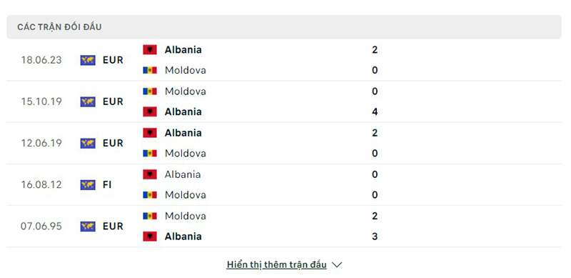 Lịch sử đối đầu giữa đội tuyển Moldova vs Albania