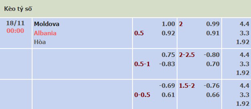Chốt kèo trận đấu giữa đội tuyển Moldova vs Albania