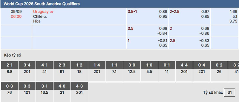 - Dự đoán tỷ số trận đấu giữa đội tuyển Uruguay vs Chile: 4-2.