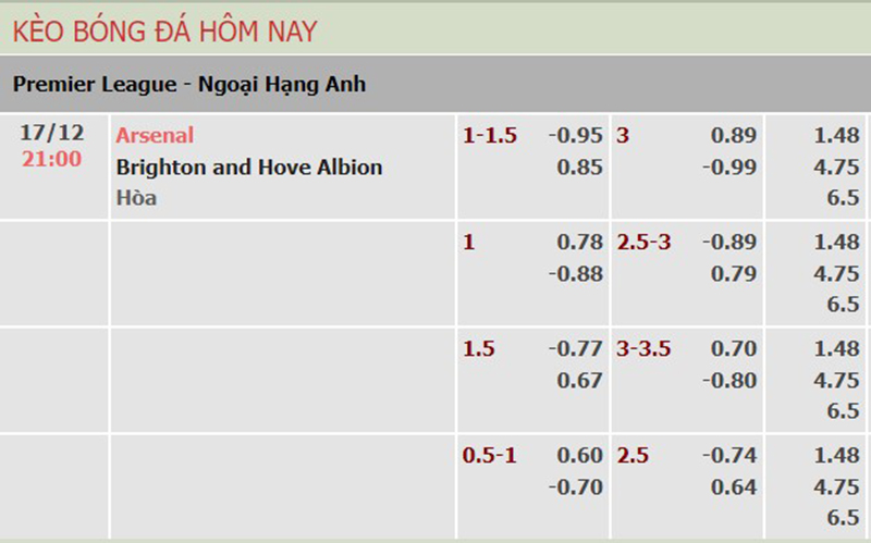 Bảng tỷ lệ kèo trận đấu giữa Arsenal vs Brighton