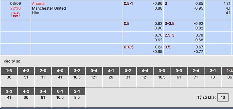 - Kèo châu Á Arsenal chấp 0.5-1 trái fulltime => Chọn Man Utd.