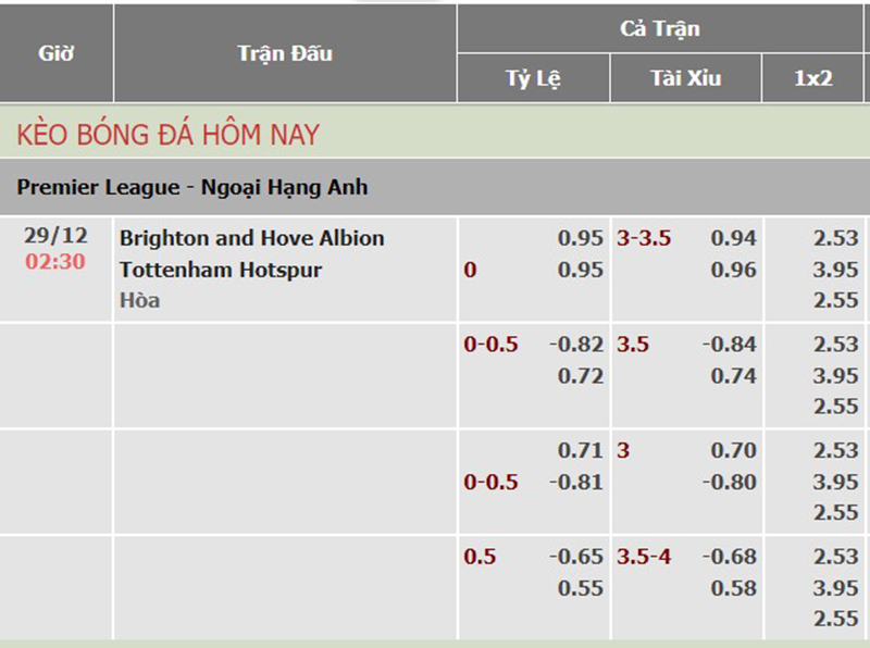Kèo tài xỉu trận đấu giữa Brighton vs Tottenham ở mức 3 1/4 là khá cao với tỷ lệ ăn cược khi nổ tài là 0.94 và khi về xỉu là 0.96.