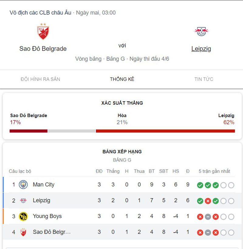 Trong khi đó, Leipzig đang có mùa giải ấn tượng tại UEFA Champions League. Đội này từ Đức đã có 6 điểm sau 3 trận, bao gồm 2 chiến thắng 3-1 trước Young Boys và Crvena Zvezda, cùng với việc đánh bại Manchester City tại sân nhà.