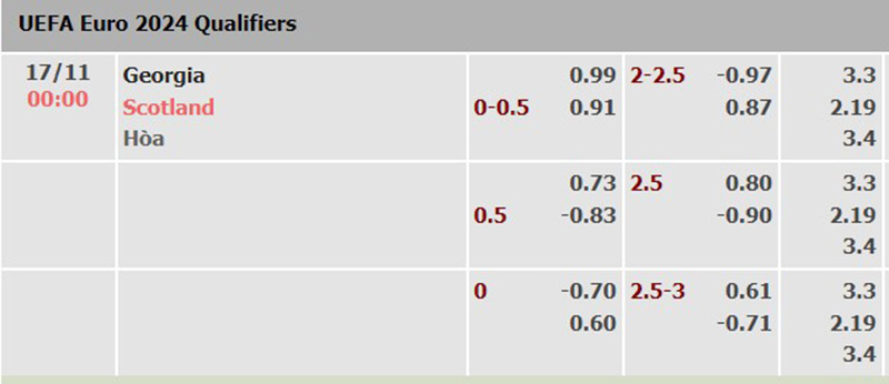 Bảng tỷ lệ kèo trận đấu giữa đội tuyển Georgia vs Scotland