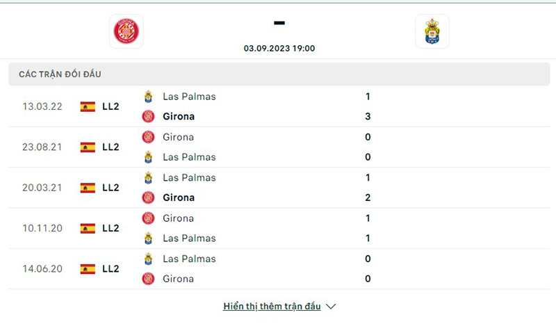 5 trận đối đầu gần đây nhất giữa đội tuyển Girona vs Las Palmas có 3 trận kết thúc với tỷ số hòa trong đó có 2 trận không có bàn thắng nào được ghi. 2 trận còn lại đều là chiến thắng của Girona.