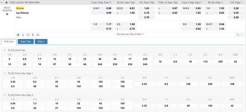 Bảng tỷ lệ kèo trận đấu giữa đội tuyển Girona vs Las Palmas
