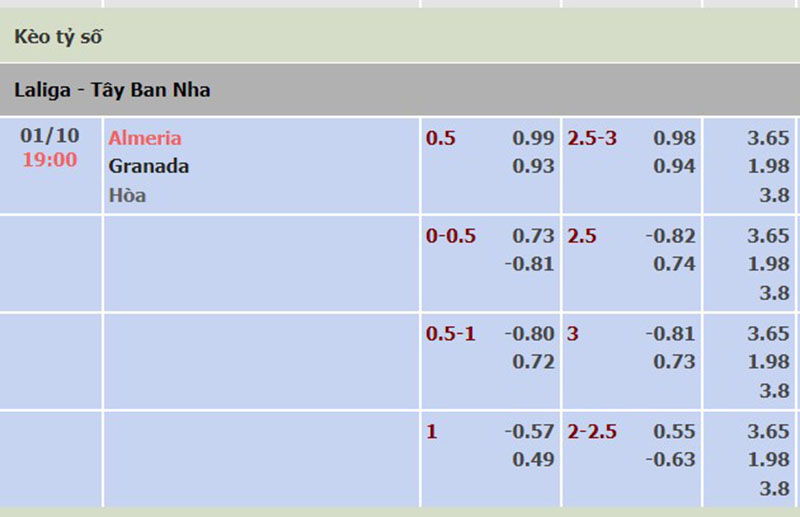 Trên thị trường giao dịch châu Á, Almeria được đánh giá cao hơn với sự chấp 0.5 trái. Almeria đã ghi tới 3 chiến thắng và chỉ hòa 1 trong 4 lần gần đây tiếp đón Granada trên sân nhà. Đáng chú ý, Almeria đã bất bại trong 3/5 trận gần nhất. Trong khi đó, Granada đã trải qua mạch 4 trận không thắng. Ngoài ra, sân nhà luôn là một điểm tựa mạnh mẽ cho Almeria.