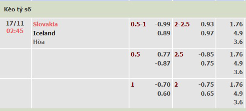 Bảng tỷ lệ kèo trận đấu giữa đội tuyển Slovakia vs Iceland
