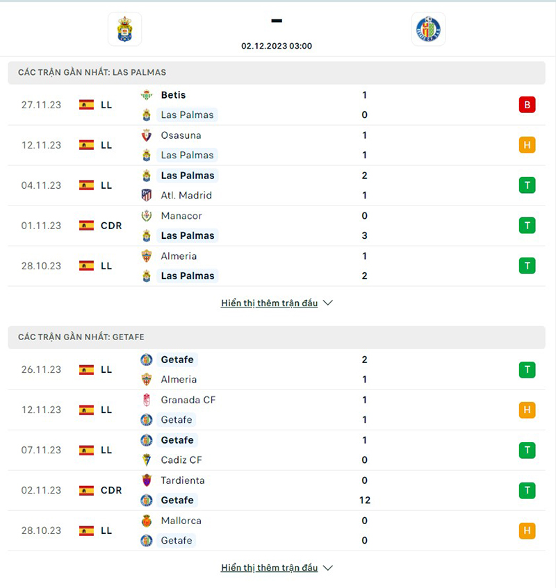 Kết quả đối đầu giữa Las Palmas vs Getafe