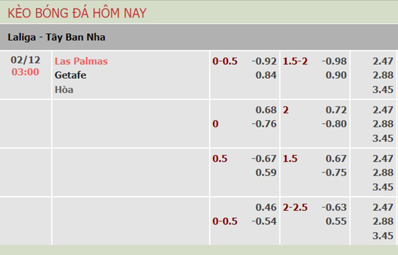 Bảng tỷ lệ kèo trận đấu giữa đội tuyển Las Palmas vs Getafe