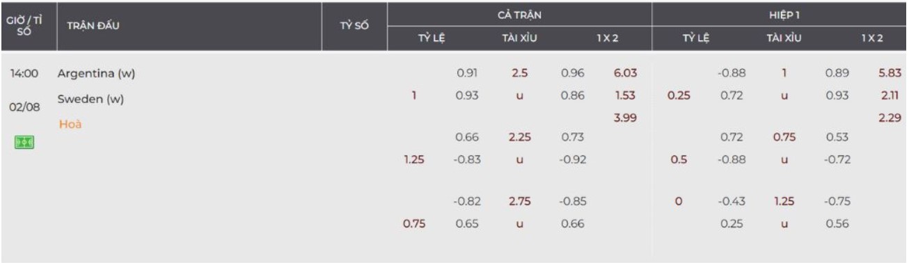Bảng tỷ lệ kèo trận đấu giữa đội tuyển nữ Argentina vs nữ Thụy Điển