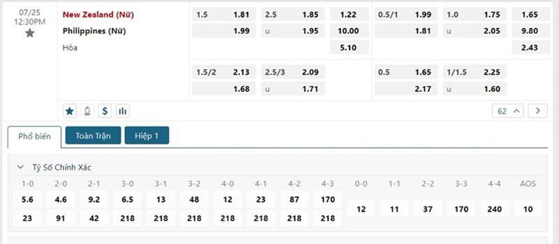 Bảng tỷ lệ kèo trận đấu giữa đội tuyển nữ New Zealand vs nữ Philippines