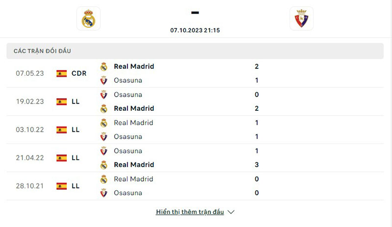 Trong 2 trận gần đây giữa Real Madrid vs Osasuna tại giải VĐQG, tỷ số của cả 2 trận đều không vượt qua con số 3. Thêm vào đó, trong 6/8 trận gần nhất của Real Madrid, họ không thể ghi được nhiều hơn 3 bàn. Osasuna cũng có kết quả tương tự, khi trong 3 trận gần đây liên tiếp, tỷ số của họ không vượt qua con số 3.