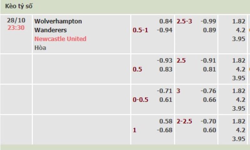 Bảng tỷ lệ kèo trận đấu giữa đội tuyển Wolves vs Newcastle