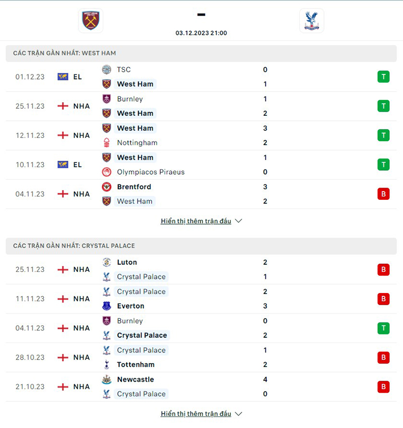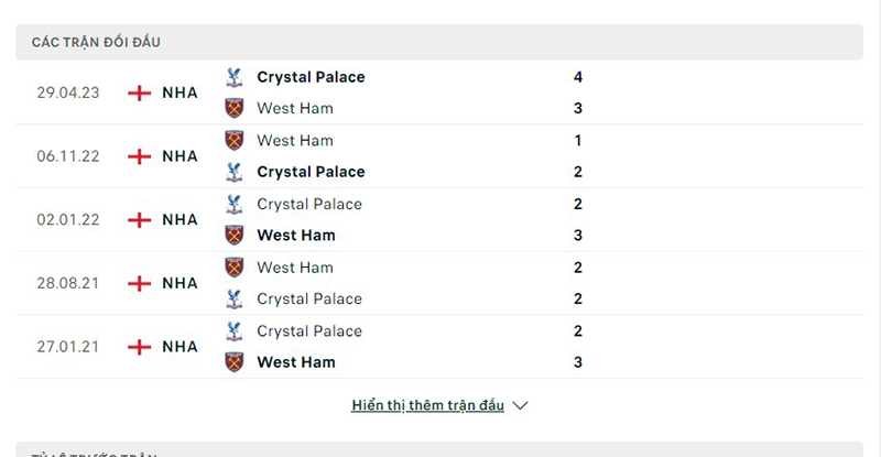Phong độ thi đấu của đội tuyển West Ham vs Crystal Palace
