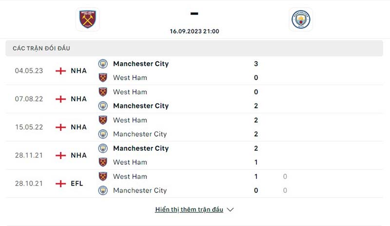 Man City chỉ nhận về 1 trận thua trước đội tuyển West Ham ở 5 lần đối đầu với nhau gần đây nhất. 4 trận còn lại Man City thắng 3 trận và hòa 1 trận.